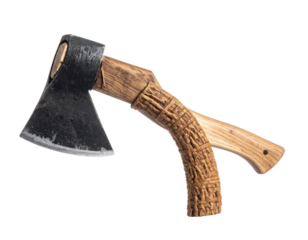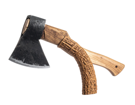 Angled overhead shot of a worn steel axe with a detailed wooden handle