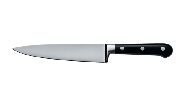 A stainless steel chef knife with a black handle on a isolated on transparent background