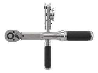 Cross-shaped lug wrench with rubber grips for better control in tire service.