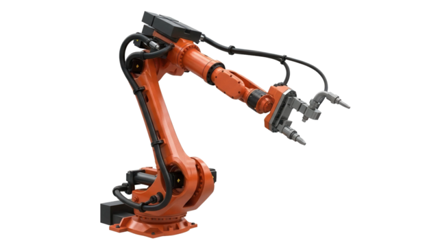 Orange industrial robotic arm with gripper mechanism, cut out, stock png, isolated on transparent background
