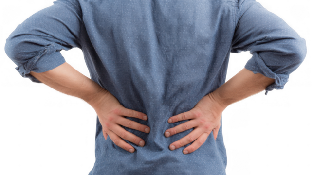 Young woman gripping her lower back with both hands, experiencing discomfort from backache, set against a transparent background, highlighting the struggle with pain and tension