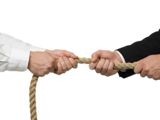 two hands, one in a white shirt and the other in a black suit, gripping a thick rope against a plain white background.