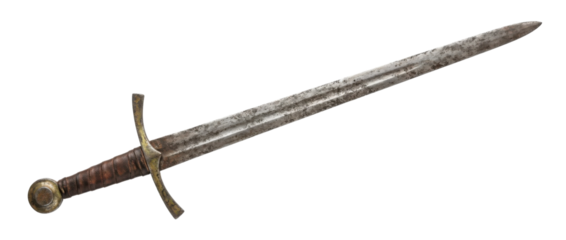 An intricately detailed single-handed sword, with ornate handle and cross-guard, rests diagonally across the frame