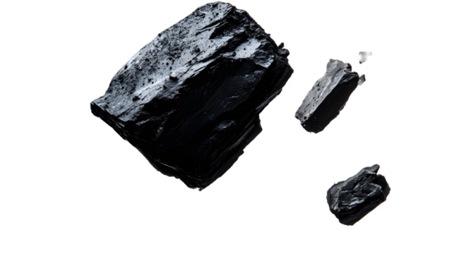 Rock fragment on black background. A textured, rugged, gray, and brown stone shard, sharply lit