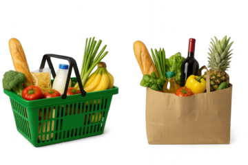 Cheerful couple holding paper grocery bags with fresh produce transparent