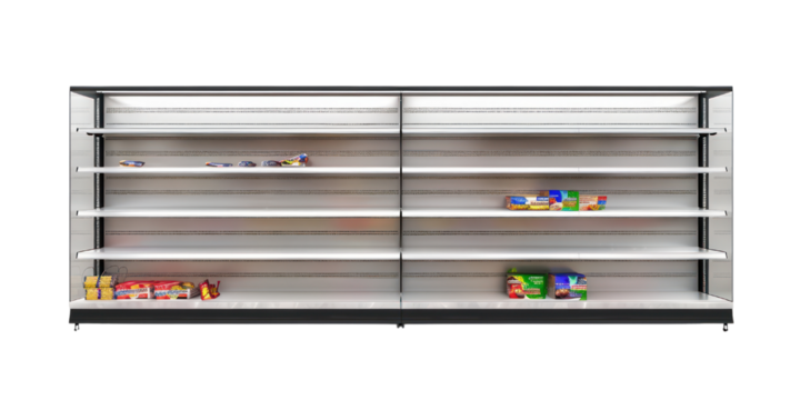 Empty supermarket shelf facing the viewer, Empty store shelf, clean display, Supermarket, empty, isolate on transparent png.