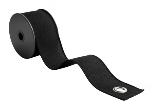 A roll of black textured ribbon with a grommet on the end isolated on transparent background