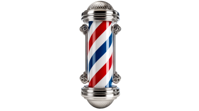 Classic barbershop pole with red white and blue stripes and ornate silver cap and base used for salon signage and vintage grooming business decor.