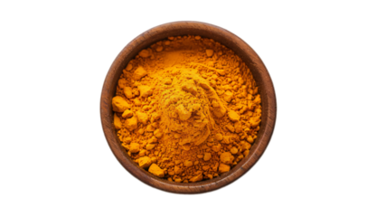 Wooden bowl of yellow spice on transparent background