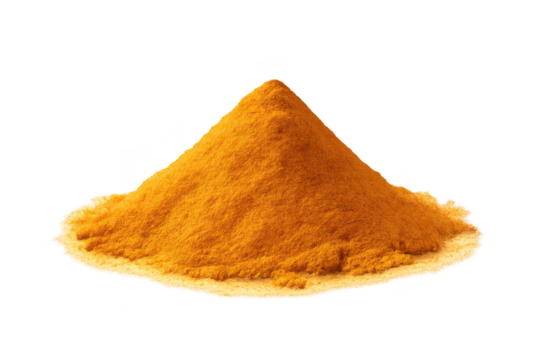 Fresh turmeric roots with orange flesh and green leaves. arranged artistically with a heap of bright yellow turmeric powder. ideal for culinary and health-related uses