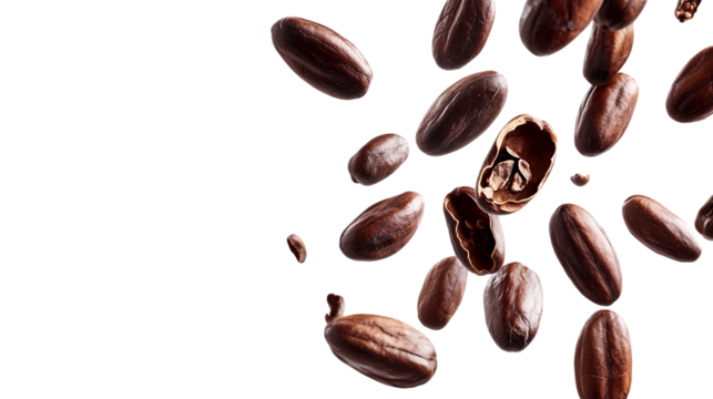 Ten black peppercorns falling against a transparent background, creating a dynamic and flavorful visual