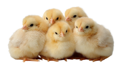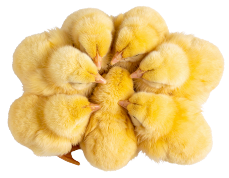 Group of Baby Chicks Huddled Together, Top View, isolated on a transparent background.
