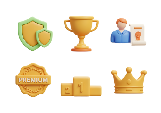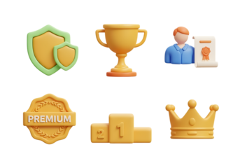 3d icon of set of 3d icons representing success, awards, and security, isolated on transparent background