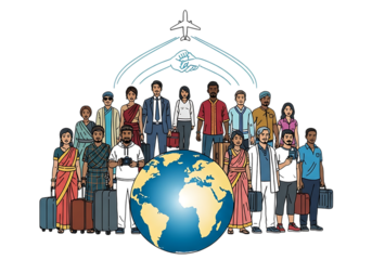 Diverse group of people with luggage around the globe, ready for international travel isolated on transparent background