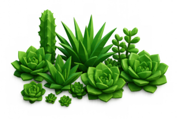 Low poly succulent plants and cacti arrangement creating a digital desert garden with transparent background