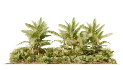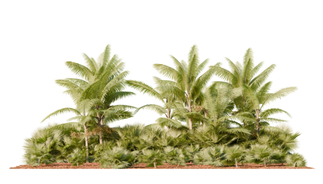 Dense group of tropical palm trees with lush green fronds and layered foliage on brown mulch ground, isolated cutout for landscape or garden design