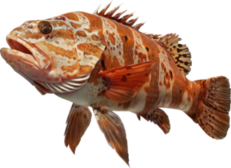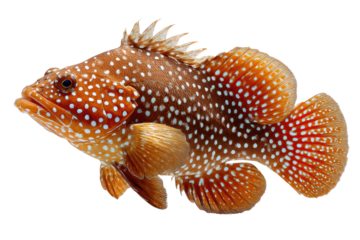 A detailed illustration of a vibrant orange and white spotted fish, possibly a type of grouper, isolated on a transparent background. background removed