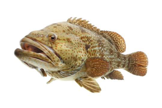 Set of Grouper fish with white spots and intricate fin details isolated on white transparent background, concept of aquatic wildlife