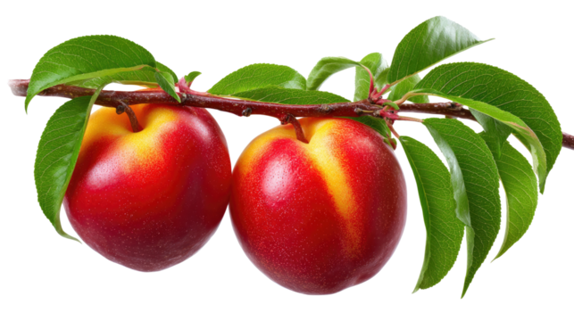 Fresh Nectarines on a Branch: A close-up of two ripe nectarines hanging from a branch, showcasing their vibrant red and yellow skin. The leaves are lush green.