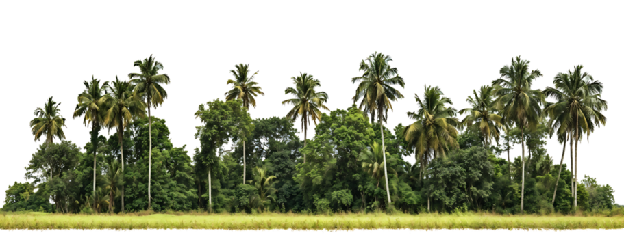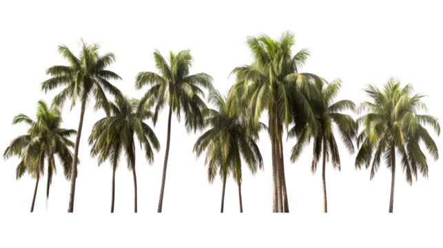 Natural landscape showing a lush grove of tall coconut palm trees against a transparent  background, creating a tropical island scenery with dense green foliage