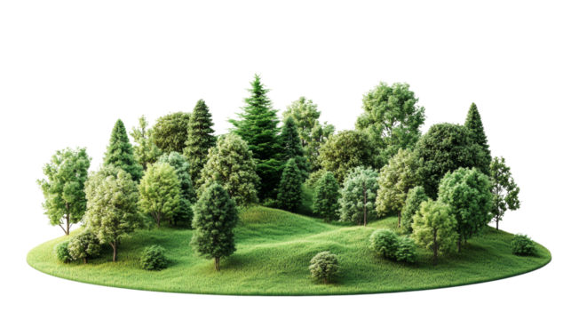 Lush evergreen forest grove offering serene natural beauty for peaceful outdoor scenes and environmental projects, Isolated on white background