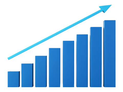 3d rendering of growing blue graph bars with an upward arrow, representing increasing profits, on a transparent background