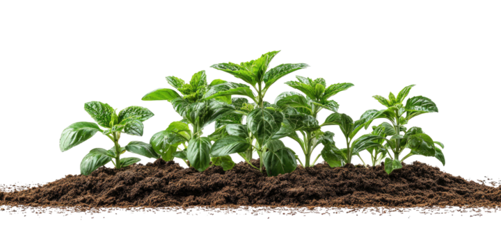 Agricultural field with rows of young plants isolated on transparent background