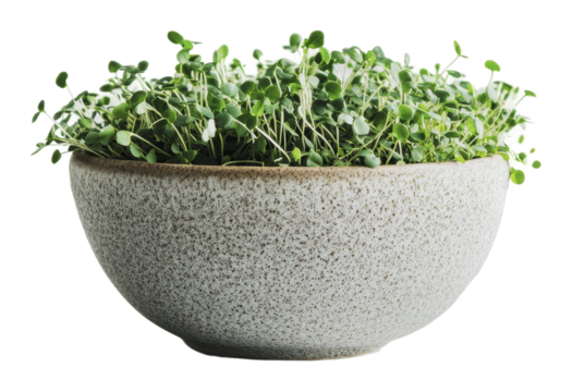 Fresh microgreens growing in a textured bowl, cut out - stock png.