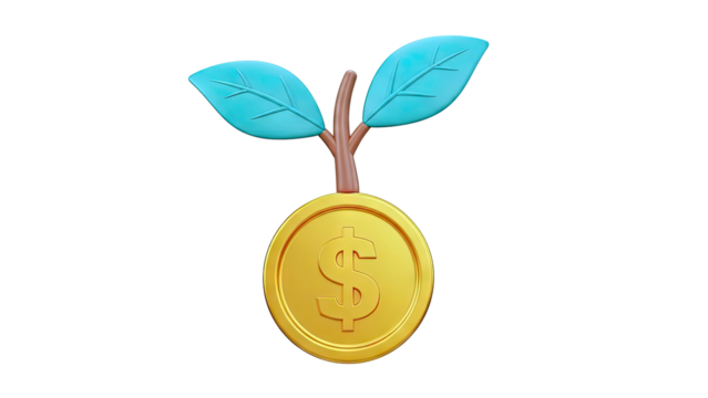 A visual representation of financial growth, showcasing stacks of coins with small plants growing out of them, symbolizing investment and prosperity, isolated on transparent background