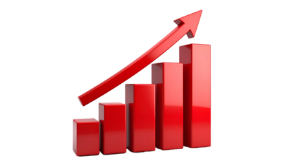 A 3D rendered red bar chart with an upward trending arrow against a black background