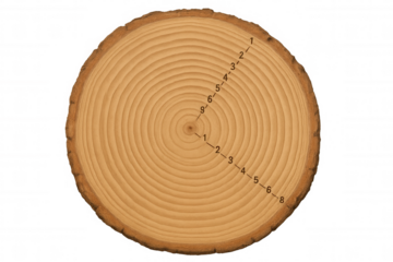 Wood tree ring cross-section with growth year numbers, showing age and dendrochronology on transparent background