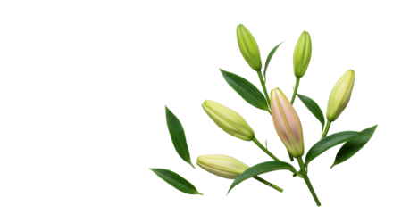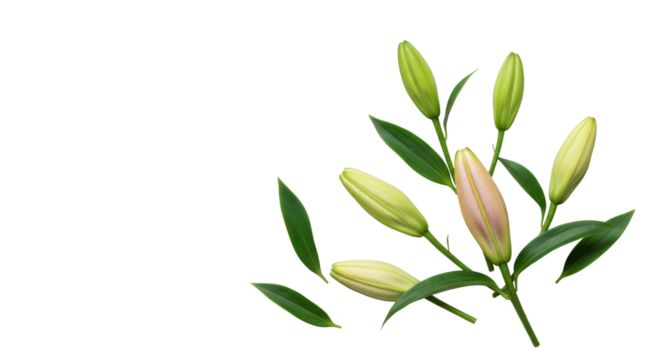 Unblemished lily flower buds, pale green to soft pink, with vibrant green leaves in a dynamic flat lay on a clean light studio background, soft shadows, concept of organic growth and future potential