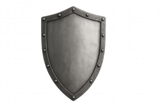 Medieval knight shield with metal surface and rivets, symbolizing protection, security, strength, and defense on transparent background