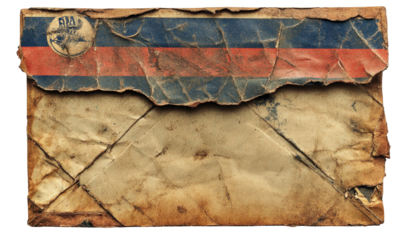 Distressed, aged envelope with faded blue, red stripes and circular emblem