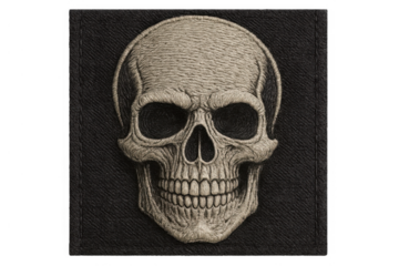 Embroidered skull patch symbolising death, grunge, rock, biker culture, and rebellion on transparent background