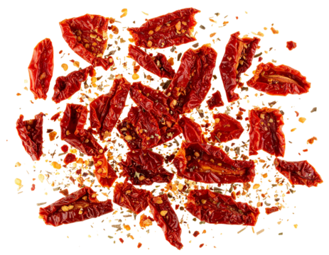 Scattered Dried Tomato Pieces with Crumbs, Organic Messy Layout, Top View, isolated on transparent background