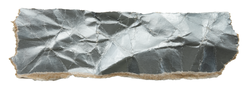 A piece of crumpled silver paper with folds and wrinkles on a white background. Torn paper or cardboard