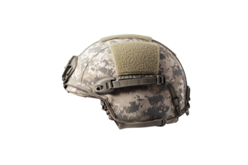 Camouflage helmet with a green patch on the back, isolated