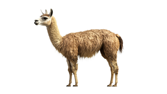llama standing in side profile, soft brown woolly coat, domesticated Andean mammal, isolated on white background