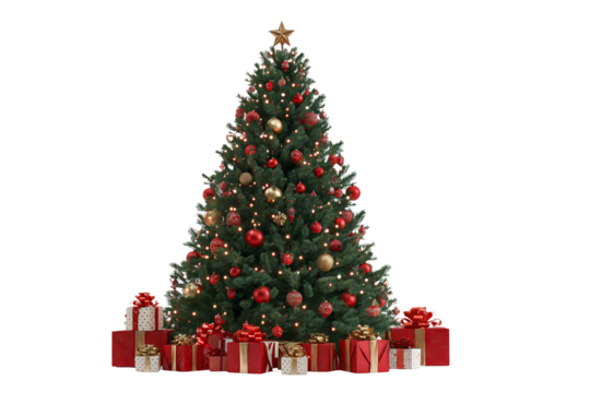 Decorated christmas tree with red and gold ornaments and gifts on PNG, christmas, christmas tree, tree, ornaments, christmas decorations, decorations, holiday, holidays, festive, winter, new year, g