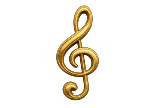 Golden treble clef, also known as g-clef, indicating music, harmony, and creative sound, rendered with a transparent background