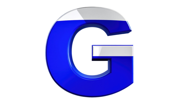 Shiny, 3D, blue letter "G" with white highlights, isolated against a black background
