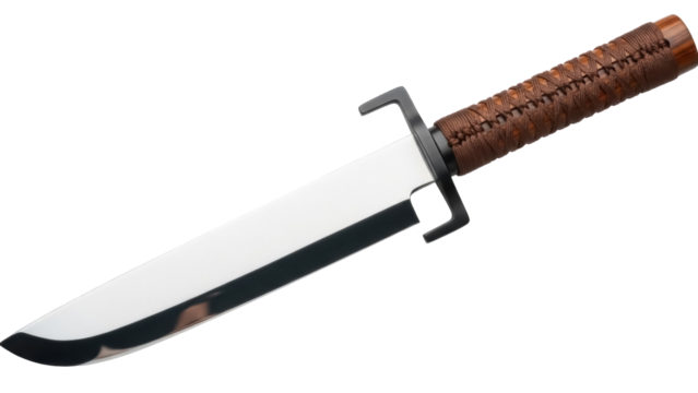 Japanese tanto knife isolated PNG, short sword with brown handle and black guard on transparent background, martial arts weapon