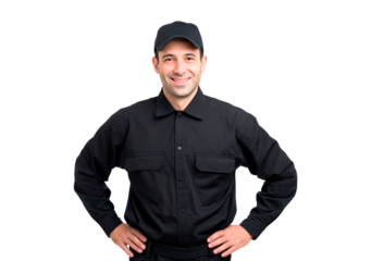 A security guard in a black uniform, holding a walkie-talkie , white background.