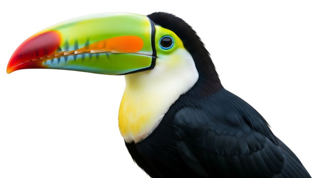 Flying toucan isolated on transparent background with vibrant colors in the beak