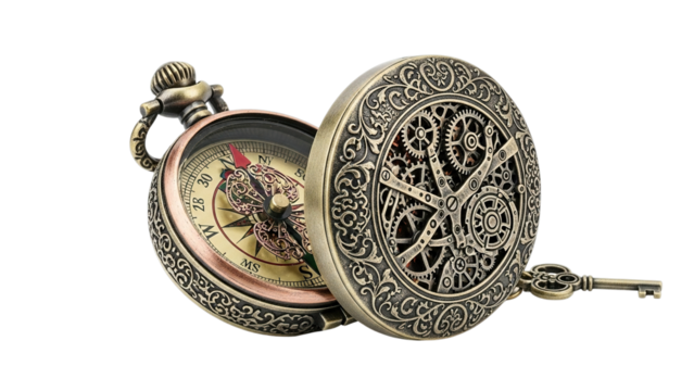 Antique pocket compass with intricate gears and ornate key, vintage exploration tool