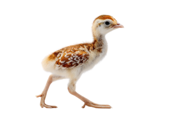 A cute, fluffy young guinea fowl chick stands alertly on a solid transparent background, showcasing its distinct brown and white speckled plumage. background removed