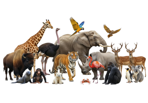 A diverse group of animals isolated on white, a collection of wildlife creatures