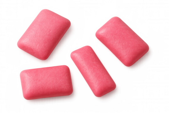 Four pink rectangular chewing gums falling against a transparent background, ready for refreshing breath