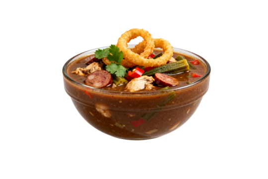 [Transparent Background PNG]Bowl of Gumbo with Chicken Sausage and Onion Rings
